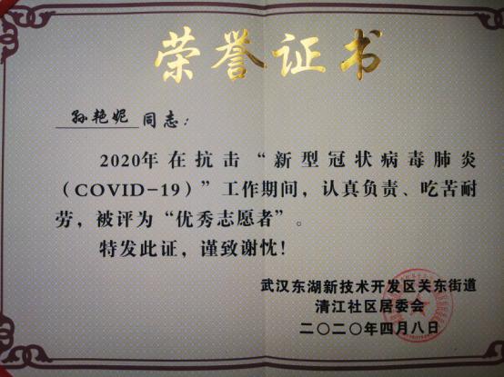 志愿服务期间,她细心对小区30余户100余人进行电话或者微信核实,对每一户的自住或者出租、人员身体情况、家中是否有慢性疾病、重病重症患者等信息一一核实,确保不漏掉一户。她积极转发便民信息50余条,告诉居民快递提取办法、出门(上班、就医)流程,以及天然气圈存、水卡充值、小区周边药房开放时间、续交停车费等信息,对于家有70岁以上老人无子女在身边的住户,她一对一帮扶,定期送菜上门。同时,她自发组织业主捐款27335元,并组织大家捐赠口罩1650个、防护手套40多、酒精300瓶,为社区防疫提供集体力量。